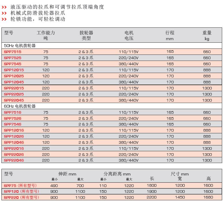 SPP系列重型拨轮器有18种类型,工作能力从75到220吨。根据人体工程学理论设计的重型液压拨轮器的特点是有一个可移动的推车和两个垂直的支撑,这样使用起来更稳定和安全,用户也可以根据想要的固定位置来调整高度。所有的型号包含可以180°旋转自动定心拉爪和无线遥控器,使操作更容易和安全。非常适合应用在钢铁厂,矿山,造船厂,石化行业维修和维护这些领域。