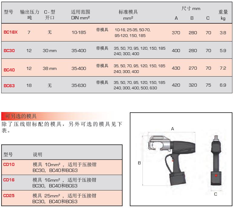 BC系列电池压线钳有4个型号可供选择,有C型开口和平行导向开口带360°旋转头设计两种。