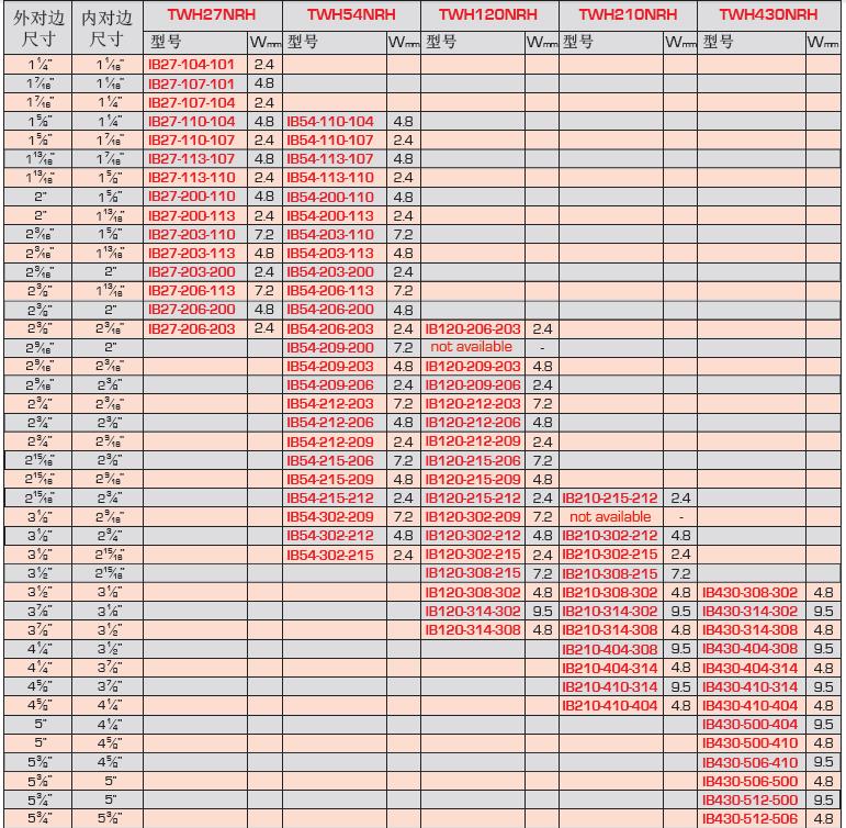 Hi-Force六角变径套用于减小TWH-NRH英制工作头的[见81页]六角对边尺寸,方便使用,费用经济。只要先选外六角对边尺寸[即工作头尺寸],再选所需要的内六角直径就可以选出型号。请注意,当用变径套时,变径套厚度[见下面的“W”尺寸]必须加到工作头的最小半径尺寸上。